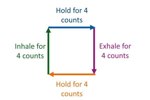 Inhale through your nose to the count of four, hold the breath in for four, exhale through your nose to the count of four and hold again for four seconds. Repeat this grounding practice five times to settle your nervous system.